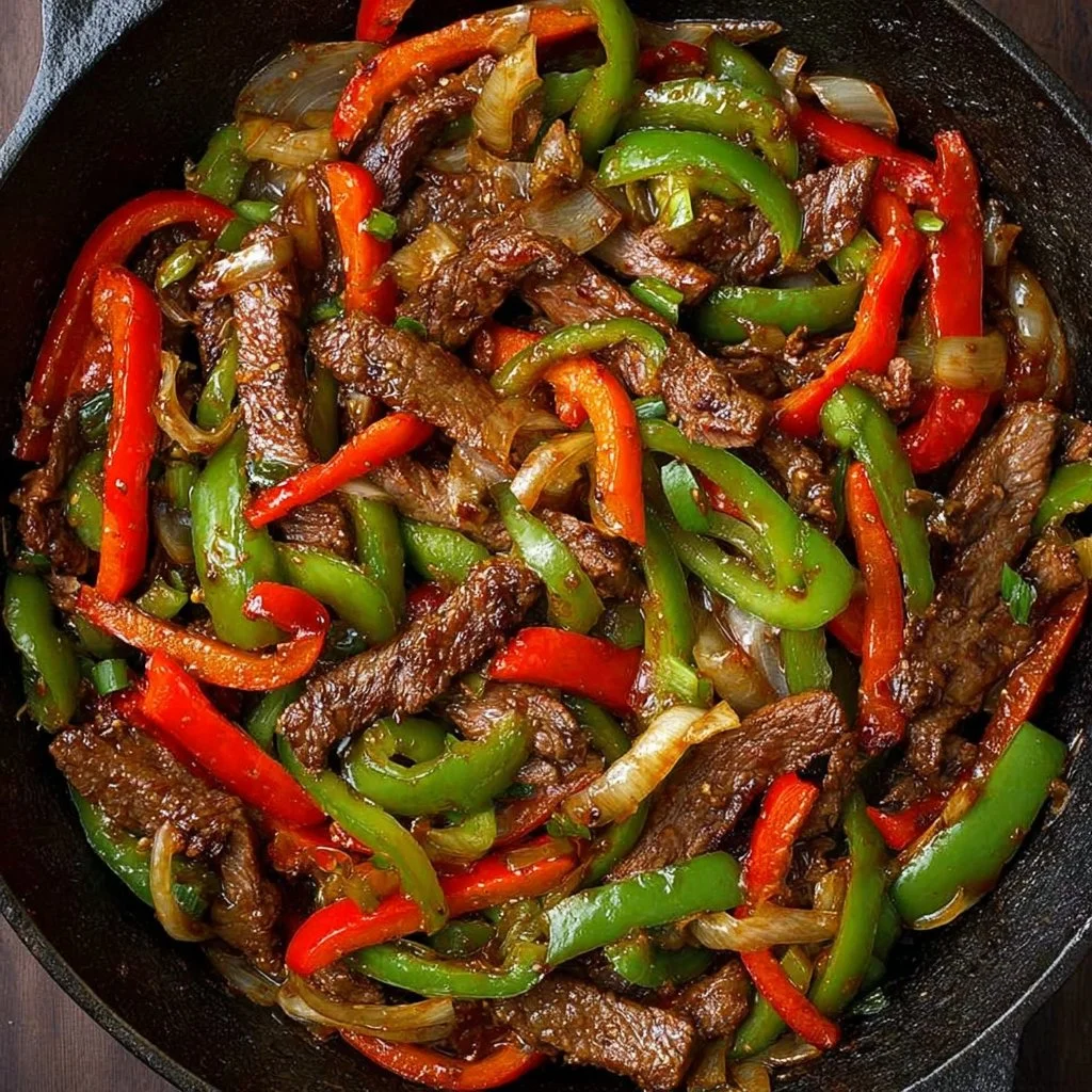 A quick and delicious protein-packed stir fry featuring flank steak and colorful bell peppers, perfect for weeknight dinners.