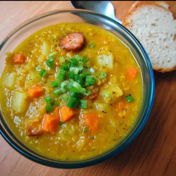 A comforting bowl of split pea soup enriched with garlic, turmeric, and chorizo, perfect for family gatherings or quiet weeknight dinners.