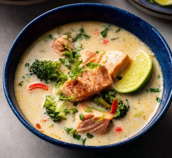 A warm, hearty soup featuring silky coconut milk, tender salmon, and vibrant vegetables.
