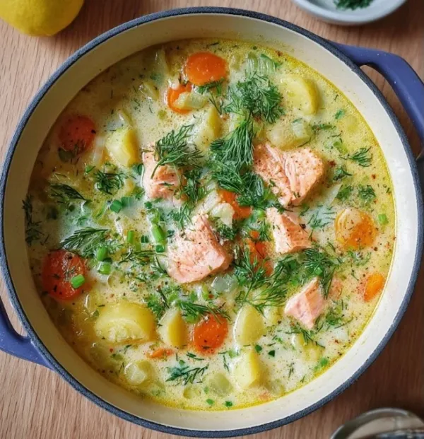 A cozy, nutritious soup that combines fresh salmon and hearty vegetables, perfect for warming your family around the dinner table.
