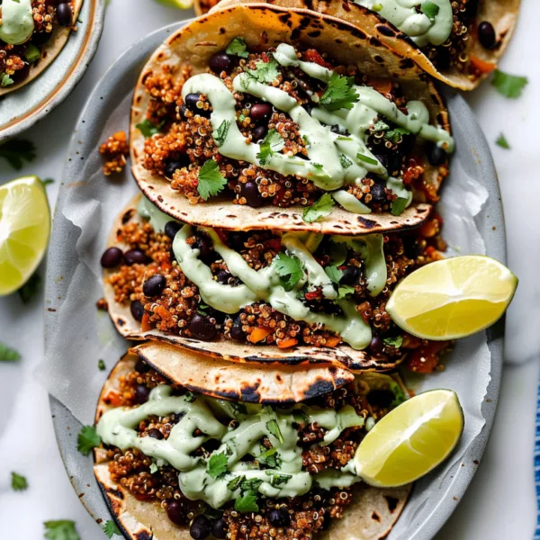 These wholesome black bean quinoa tacos have become my go-to weeknight dinner when I want something satisfying but light. The combination of protein-rich quinoa and creamy black beans creates a filling that’s both hearty and nutritious, while the bright cilantro lime crema adds just the right amount of tanginess to bring everything together.