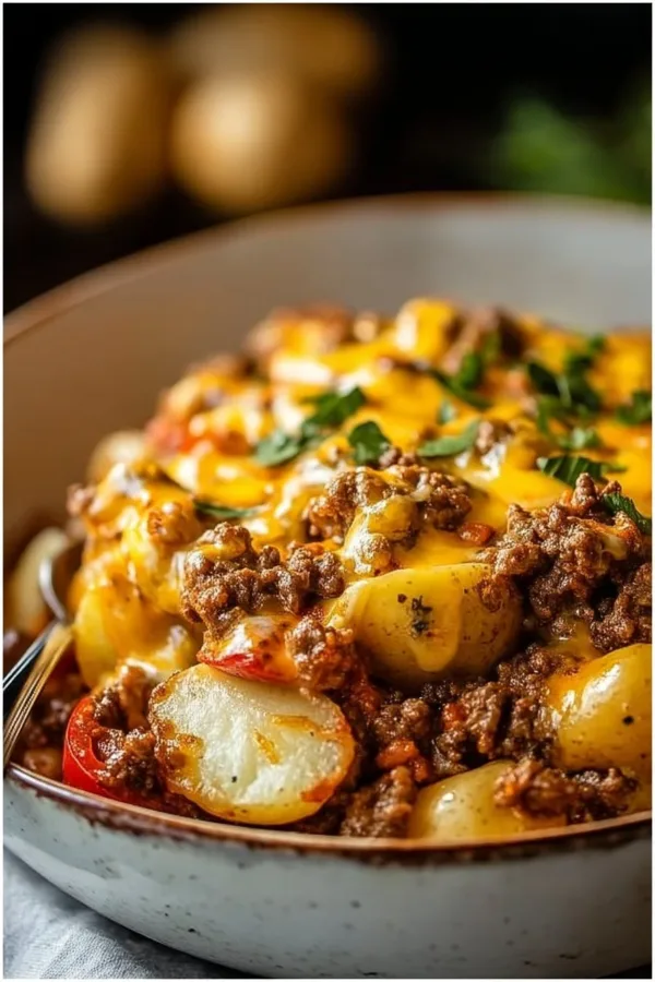 Cheesy Ground Beef & Potato Casserole works because it converts simple pantry ingredients into a meal with clear textural contrast, tender layered potatoes against browned beef, and a cheesy surface that browns under heat. It is reliable on busy nights, forgiving of small timing shifts, and scales to feed a family without complicated steps.