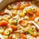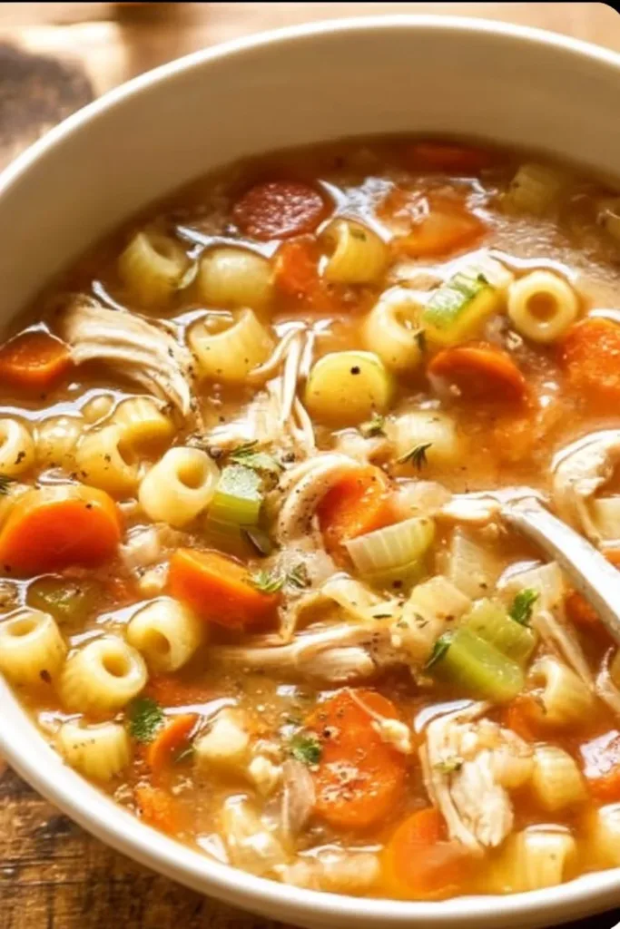 A warm, savory stovetop broth-based soup featuring shredded chicken, ditalini pasta, diced vegetables, and thyme, perfect for weeknight dinners and leftovers.