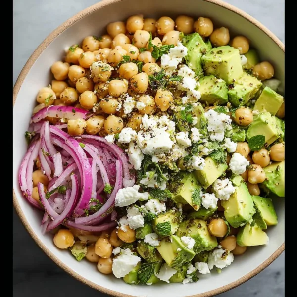 A vibrant and refreshing salad that combines chickpeas, creamy avocado, and tangy feta cheese, perfect for summer gatherings or a quick lunch.