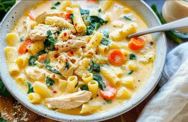 A hearty, comforting soup featuring tender chicken, pasta, sweet carrots, and fresh spinach in a rich, creamy broth. This nutritious one-pot meal is simple to make and deeply satisfying.