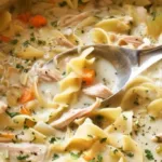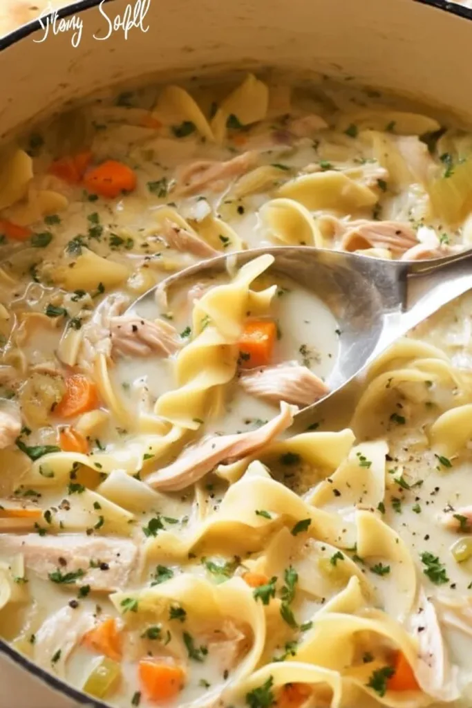A comforting and creamy chicken soup made with tender shredded chicken and hearty egg noodles, perfect for busy weeknights.