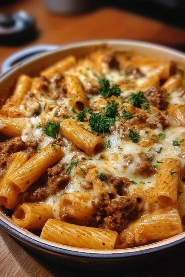 A rich and creamy pasta dish featuring ground beef, heavy cream, and Parmesan cheese, tossed with rigatoni for a deliciously comforting meal.
