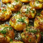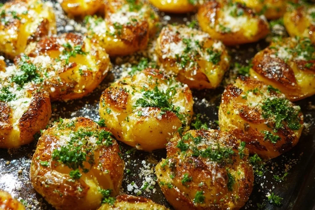 Deliciously crispy and tender smashed potatoes topped with garlic and parmesan, perfect as a side dish for any meal.