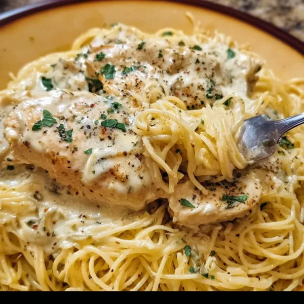 A creamy and satisfying slow-cooked chicken dish served over angel hair pasta, perfect for family dinners.