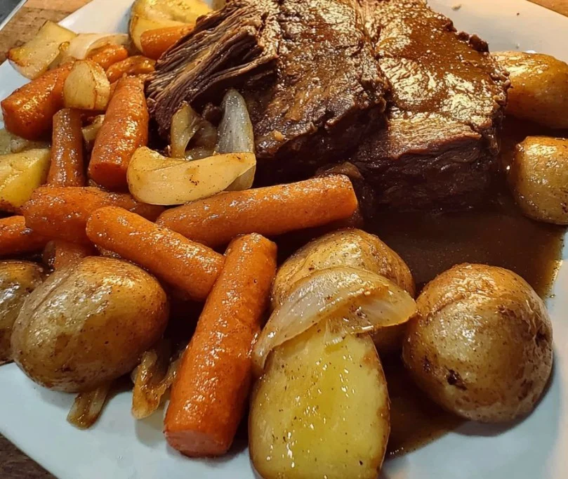 A flavorful slow-cooked chuck roast with tender potatoes and carrots, perfect for family meals.