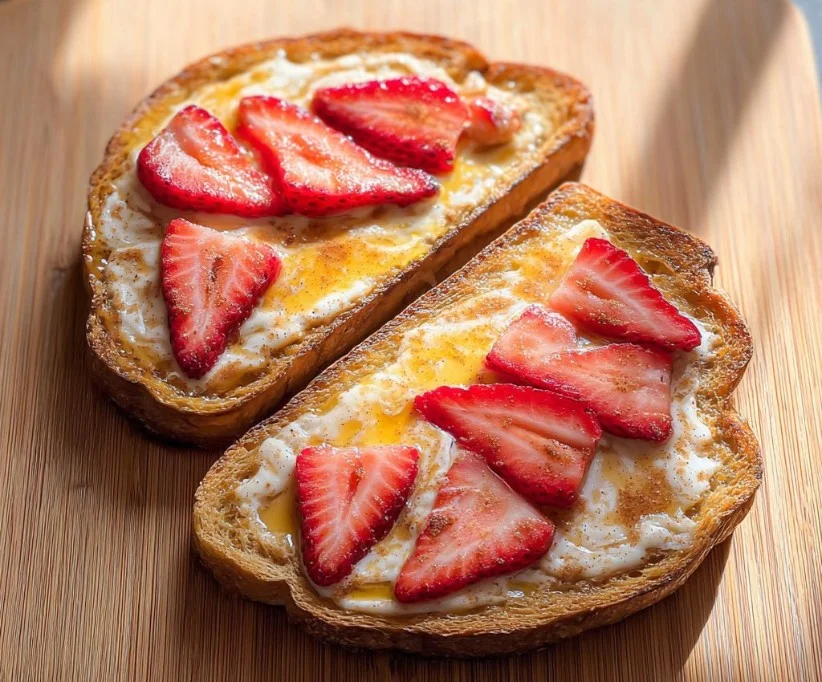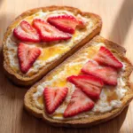 - Top your custard-filled toast with the sliced strawberries, generously piling them on.