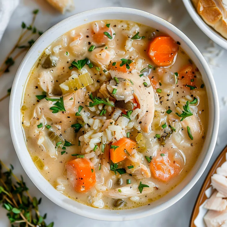 A comforting soup with tender chicken, perfectly cooked rice, and fresh vegetables in a rich, creamy broth that’s both satisfying and nourishing.
