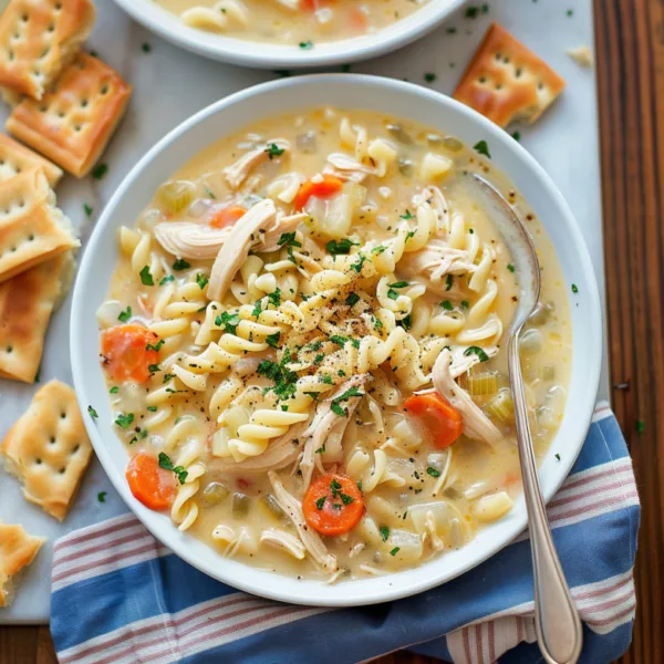 There’s something deeply comforting about a bowl of creamy chicken noodle soup on a cold evening. This rich, warming soup combines tender chicken, perfectly cooked noodles, and fresh vegetables in a velvety broth that feels like a warm hug. I’ve been making this recipe for years, tweaking it until it became our family’s go-to comfort food.