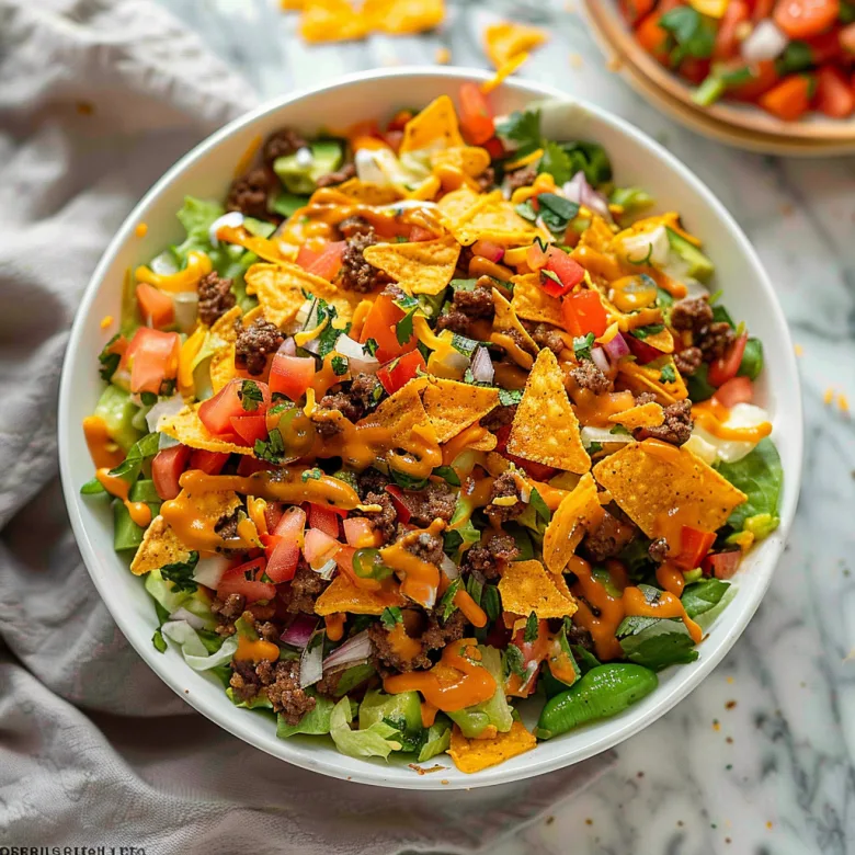 A crowd-pleasing salad combining seasoned ground beef, fresh vegetables, and crunchy Doritos with a creamy taco-inspired dressing.