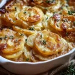 - Warm the Heavy Cream slightly, then pour evenly over the assembled bake so it settles between the slices, sprinkle remaining Fresh Thyme and a final pinch of Salt and Pepper, expert tip, warming the cream prevents shocking the potatoes and helps them start cooking immediately.