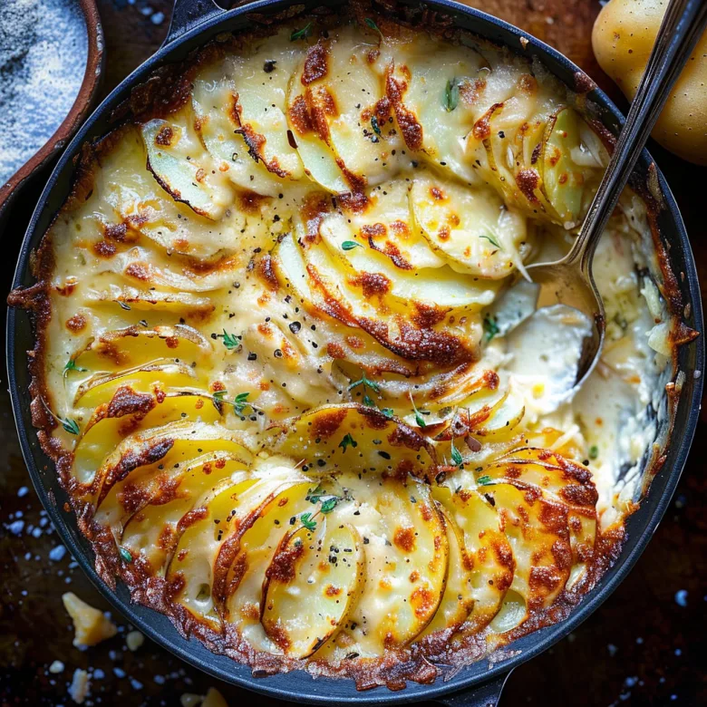 Creamy layered potato gratin with Gruyère and Parmesan cheese in a rich garlic-infused cream sauce
