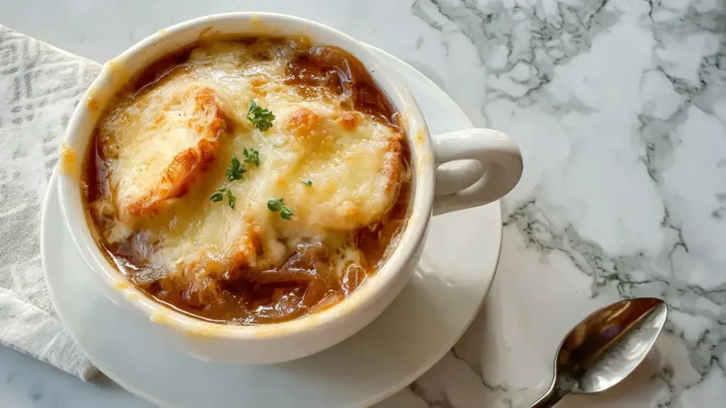 A cozy French onion soup with caramelized onions, beefy broth, and bubbling Gruyère-topped toasts, perfect for winter comfort.