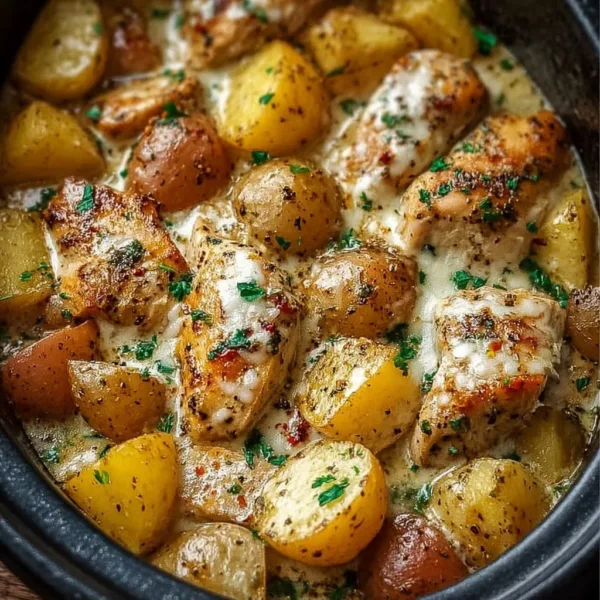 A comforting dish featuring tender chicken and baby potatoes slow-cooked in garlic and parmesan, perfect for easy weeknight dinners.