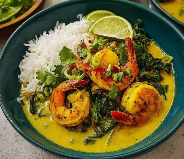 A quick and flavorful dish featuring shrimp marinated in garlic and ginger, cooked in coconut milk with spinach, perfect for busy weeknights.