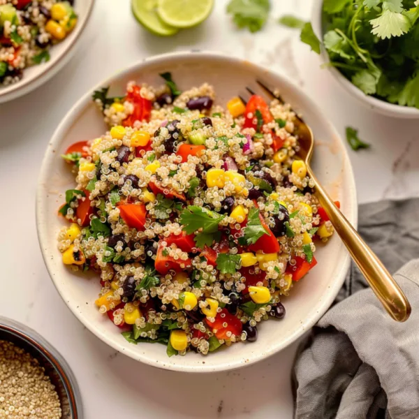 A colorful, nutritious salad featuring fluffy quinoa, black beans, corn, and fresh vegetables tossed in a zesty lime-cumin dressing.