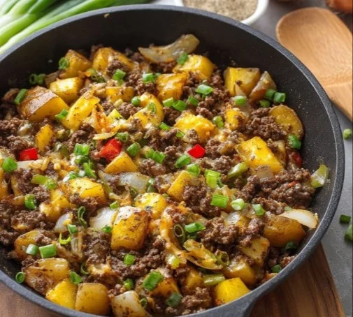 A hearty and satisfying skillet meal featuring ground beef, crispy potatoes, and melted cheddar cheese, perfect for family dinners.