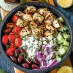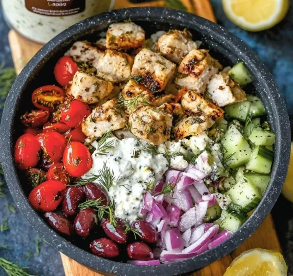 - To assemble the bowls, divide the cooked chicken among four individual serving bowls. Top each with diced cucumber, halved cherry tomatoes, sliced red onion, pitted Kalamata olives, and crumbled feta cheese. Drizzle the dressing over the bowls and finish each with a generous dollop of tzatziki just before serving.
