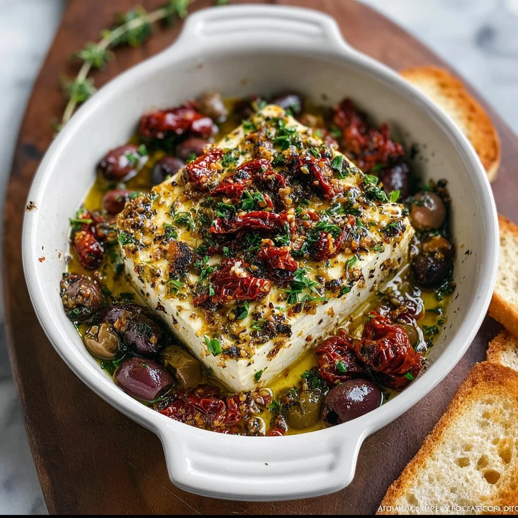 A warm and gooey baked feta cheese dish combined with olives and sun-dried tomatoes, perfect for parties and cozy evenings.