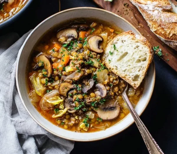 A hearty and nutritious Mushroom and Cabbage Lentil Soup perfect for warming up on chilly autumn days.