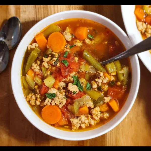 A nourishing high protein soup packed with vibrant vegetables and hearty ground turkey, perfect for cozy comfort food.