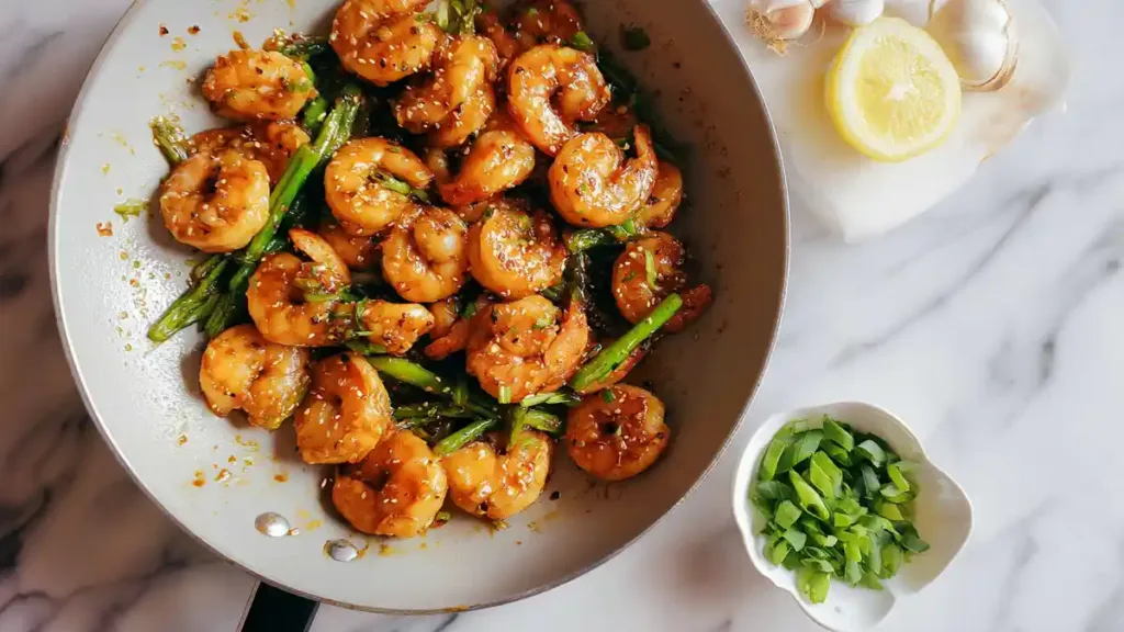 stir-fried shrimp with honey garlic sauce and green vegetables in skillet