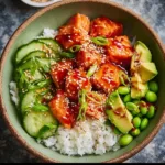 Assemble Your Bowls: Grab that cooked rice and lay it down as a base. Top with honey sriracha salmon, diced avocado, sliced cucumber, and cooked edamame. Beginner Note: Get artistic with your arrangements; make those bowls Instagram-worthy.