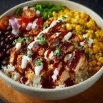 Mix the ranch dressing and BBQ sauce in a small bowl and drizzle over each bowl. Top it off with shredded cheddar cheese and sprinkle some fresh cilantro or green onions if you’re feeling fancy. Serve warm or chill it for later, and enjoy!