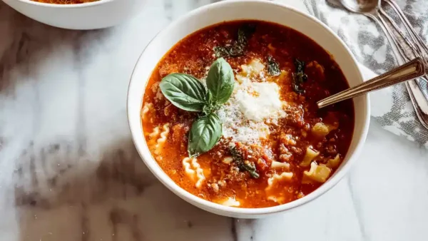 A cozy, one-pot lasagna soup packed with hearty beef, Italian sausage, and creamy cheeses, perfect for chilly nights.
