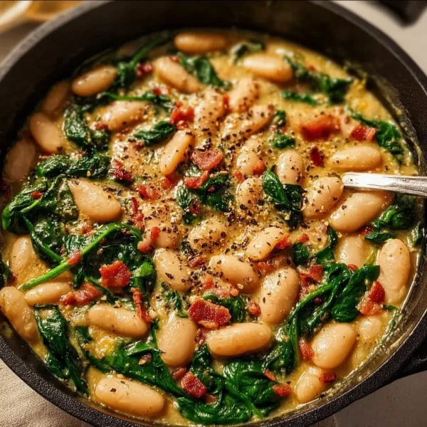 A creamy and comforting stovetop dish featuring white beans and wilted spinach, perfect for quick weeknight dinners.