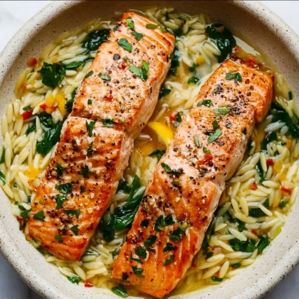 A light yet flavorful dish featuring perfectly seared salmon paired with lemon-infused orzo, ideal for family dinners.