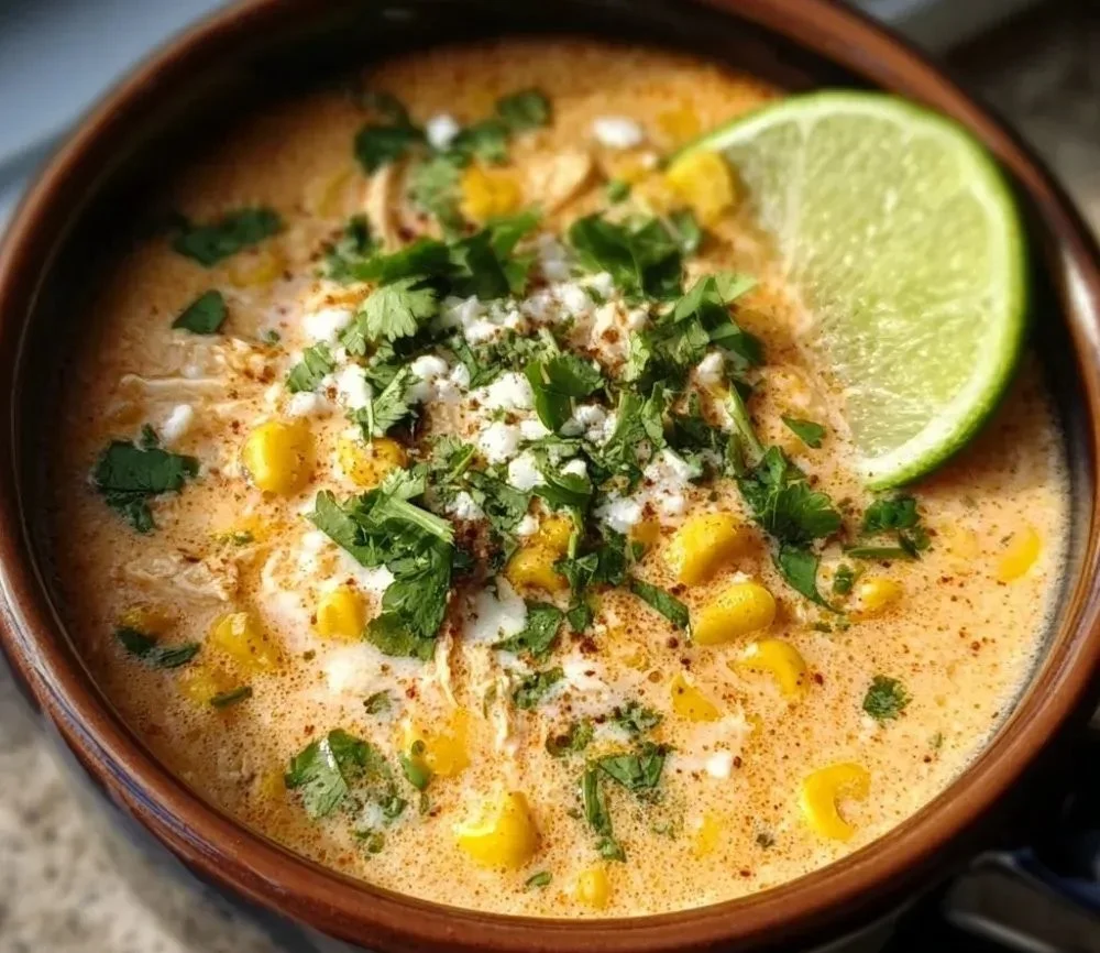 A comforting and flavorful soup inspired by the popular street food, elote, combining corn, spices, and a hint of lime.