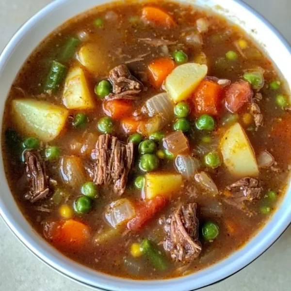 A hearty and savory soup made with slow-cooked beef, assorted vegetables, and rich tomato broth, perfect for family meals.
