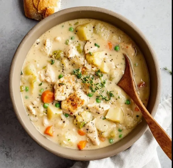 A hearty and creamy chicken pot pie soup packed with fresh vegetables and lean protein, perfect for chilly nights.