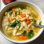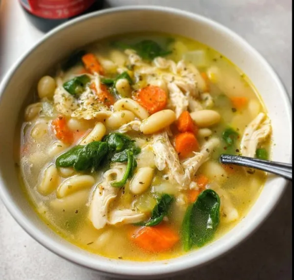 A hearty and nutritious soup featuring tender chicken, white beans, pasta, and vibrant spinach, all enhanced by a zing of lemon.