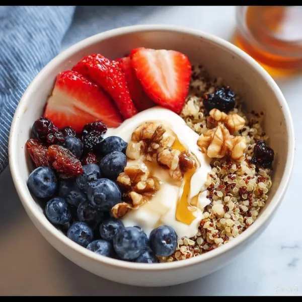 A delightful and nutritious breakfast bowl featuring quinoa, Greek yogurt, fresh berries, and walnuts. Perfect for a quick and wholesome start to your day.