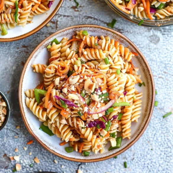 A vibrant and flavorful Thai-inspired pasta salad loaded with chicken, fresh vegetables, and a creamy peanut dressing. Perfect for lunches, potlucks, or a satisfying main course.