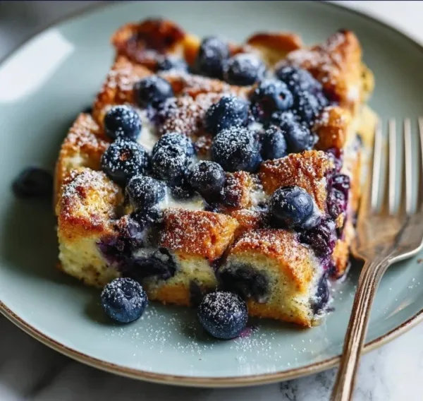 A comforting and sweet casserole made with stale bread and juicy blueberries, perfect for a hearty breakfast.