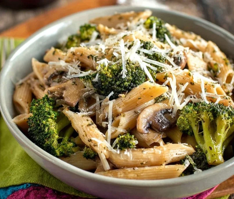 A quick and flavorful dish featuring garlic butter pasta, roasted broccoli, and sautéed mushrooms, perfect for a nutritious weekday meal.
