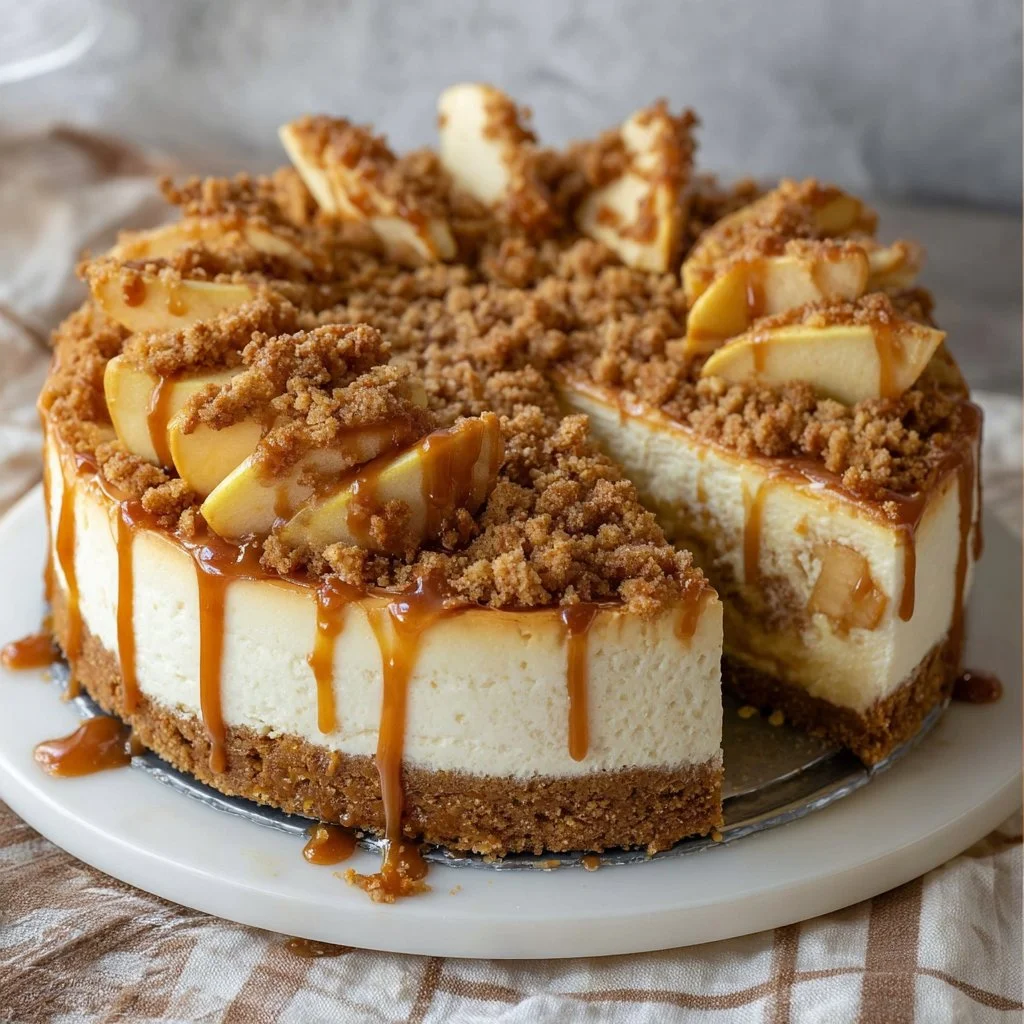 A decadent cheesecake that combines the rich, creamy texture of cheesecake with the comforting flavor of apple pie, topped with a luxurious salted caramel drizzle.