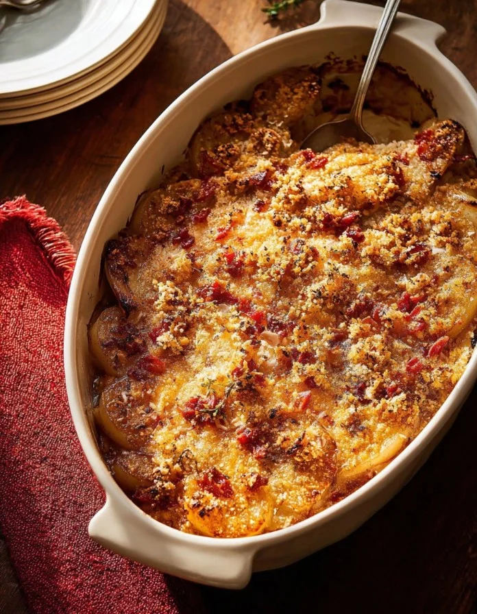 This gratin is one of those dependable recipes that hides clever technique under a friendly surface. It balances sweet, salty, crunchy, and creamy so each forkful feels composed without fuss. The real trick is texture contrast: browned butter and toasted breadcrumbs on top keep things from going soggy while pears roast until just tender. Stick to simple timing and practice the two small moves — browning the butter and crisping the topping — and you’ll have a dish that looks restaurant-level but cooks like a weekday classic.