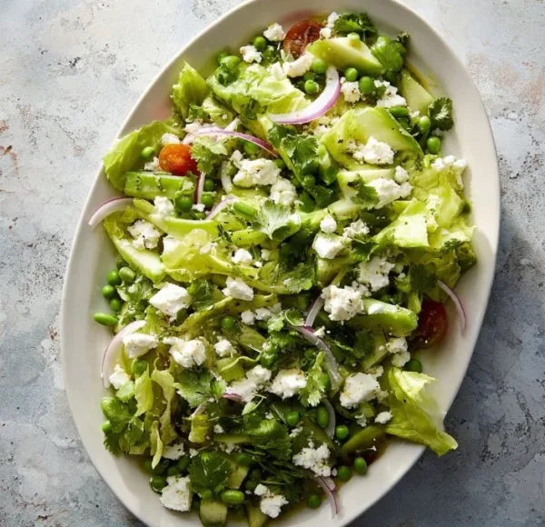 A vibrant salad packed with fresh greens, cherry tomatoes, cucumbers, and creamy feta, perfect for summer meals.