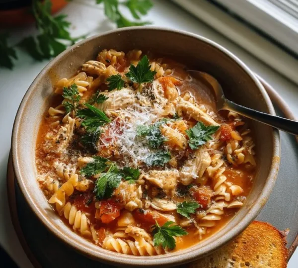 Slow-Cooked Chicken Parmesan Soup is a tomato-based soup built around slow-simmered chicken and melting cheeses. As it cooks, the chicken becomes tender and the broth thickens slightly while the cheeses melt into the base. A stir releases garlic and basil aromas from the simmering pot. It works well for weeknight dinners or evenings when you want a warm, simple meal that cooks mostly unattended.