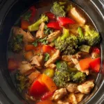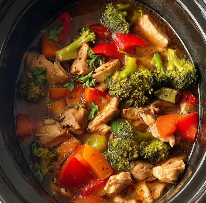 A comforting and low-effort weeknight meal featuring chicken and a colorful assortment of vegetables, cooked to perfection in a slow cooker.