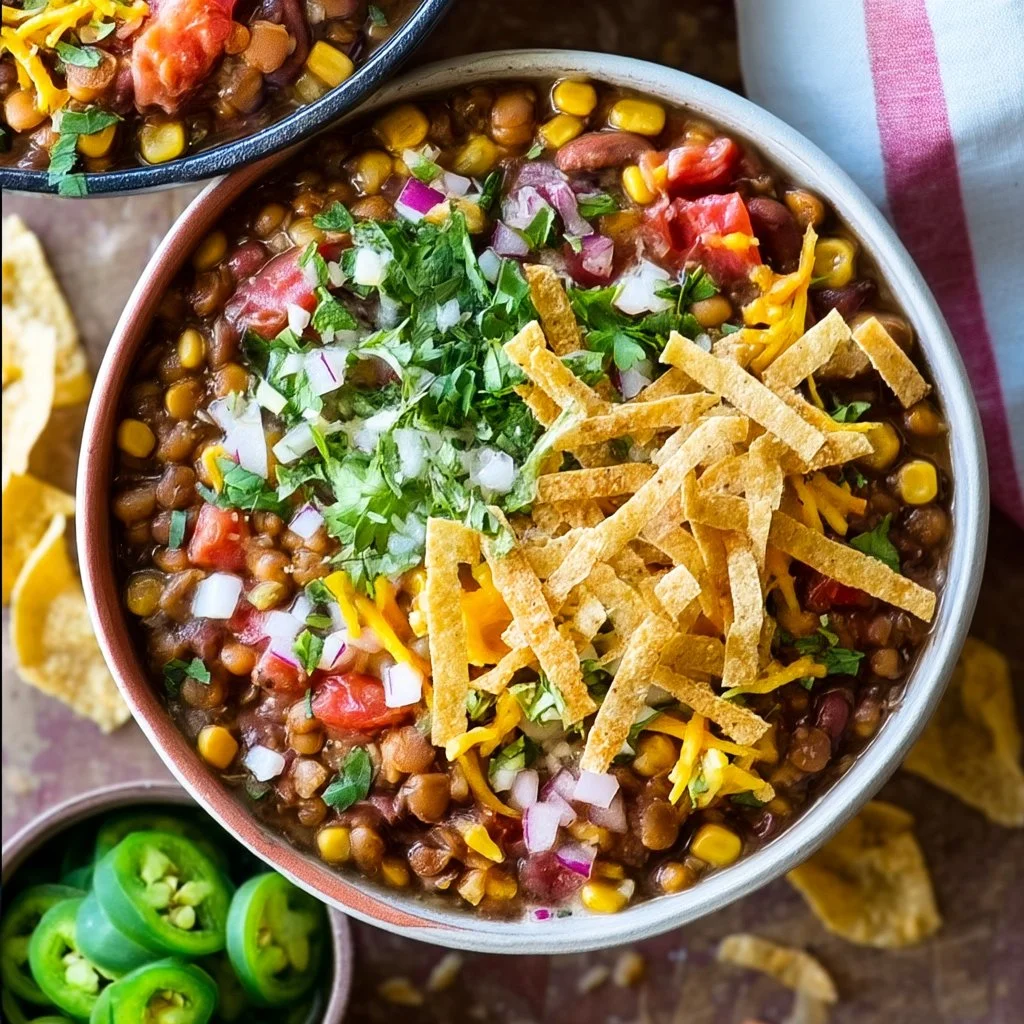 A hands-off, slow-cooked vegetarian chili packed with lentils, black beans, and taco spices, perfect for a cozy dinner.