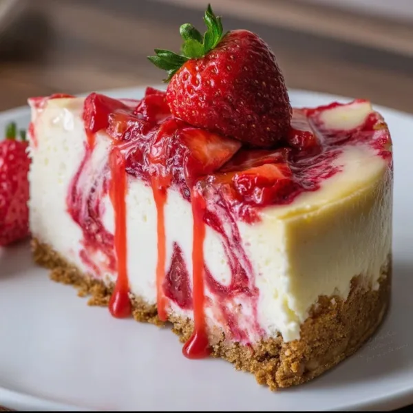 A creamy and decadent strawberry swirl cheesecake that combines rich cream cheese with vibrant strawberry puree for a delightful dessert experience.